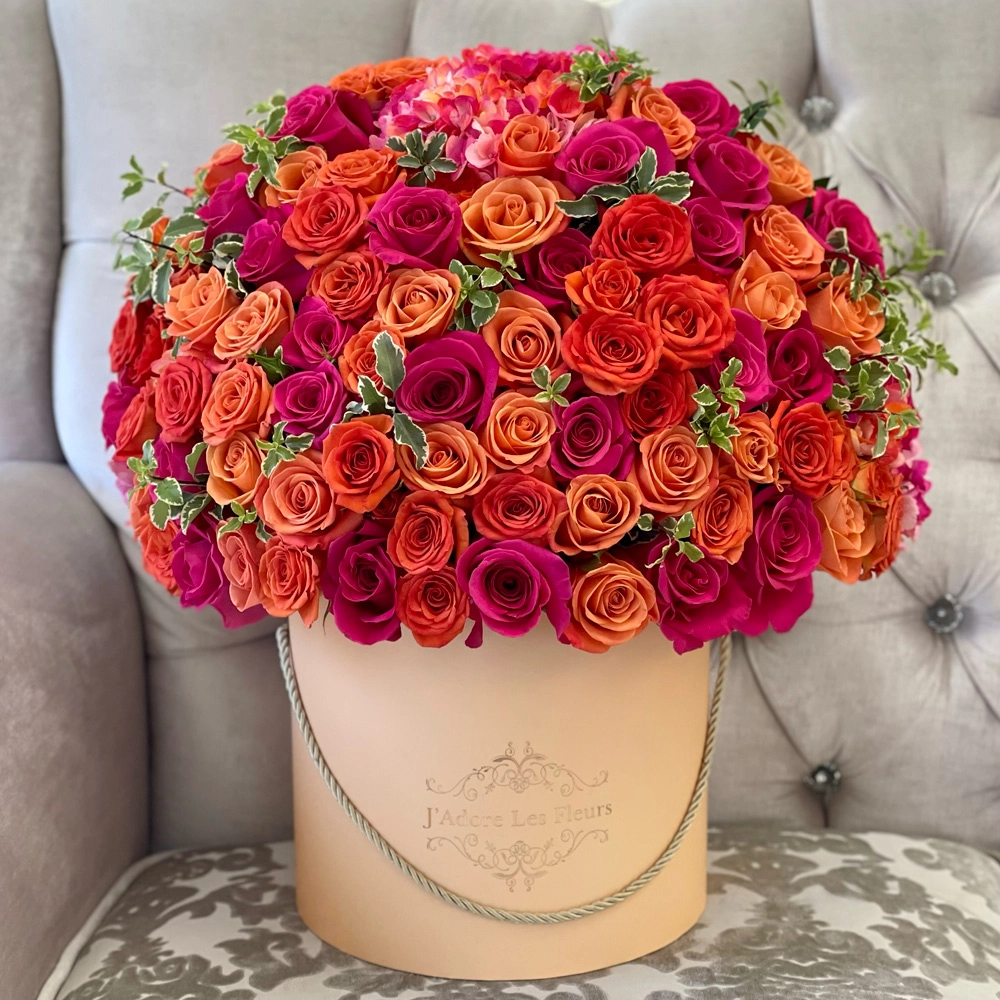 Embrace the warm glow of a Parisian sunset with “Coucher de Soleil,” a captivating arrangement nestled in our signature peach. This bouquet features a radiant blend of peach and orange hues, combining the soft allure of peach roses with the vibrant charm of orange roses. Accentuated by lush greenery, this arrangement captures the essence of a tranquil Parisian evening, evoking feelings of warmth and romance. Perfect for brightening any occasion or space, “Coucher de Soleil” brings a touch of Parisian magic and elegance to your day.