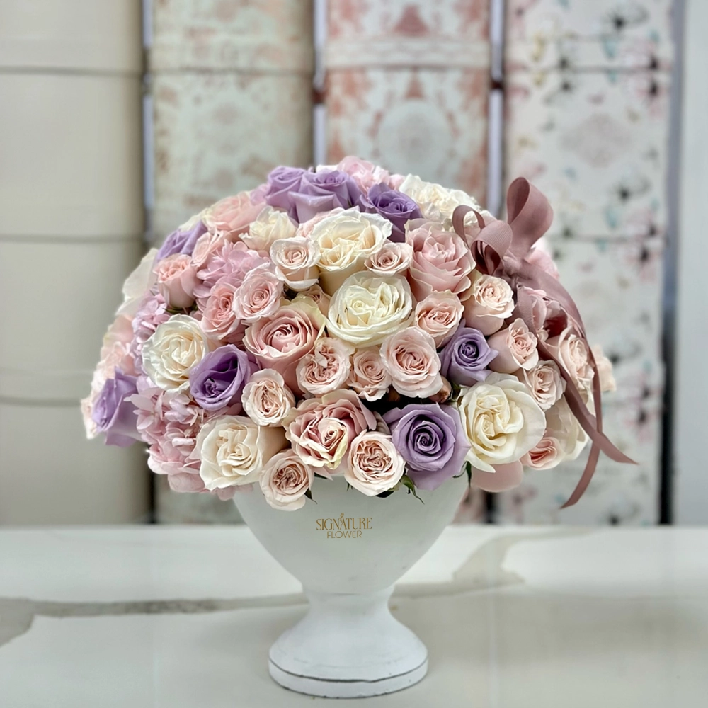 Drift into tranquility with our Élégance Pastel arrangement. Blush pink and lavender roses, accented by hydrangeas, bloom from a white pedestal vase—ideal for bridal showers in Dubai, spa centers, or get-well-soon flowers UAE.