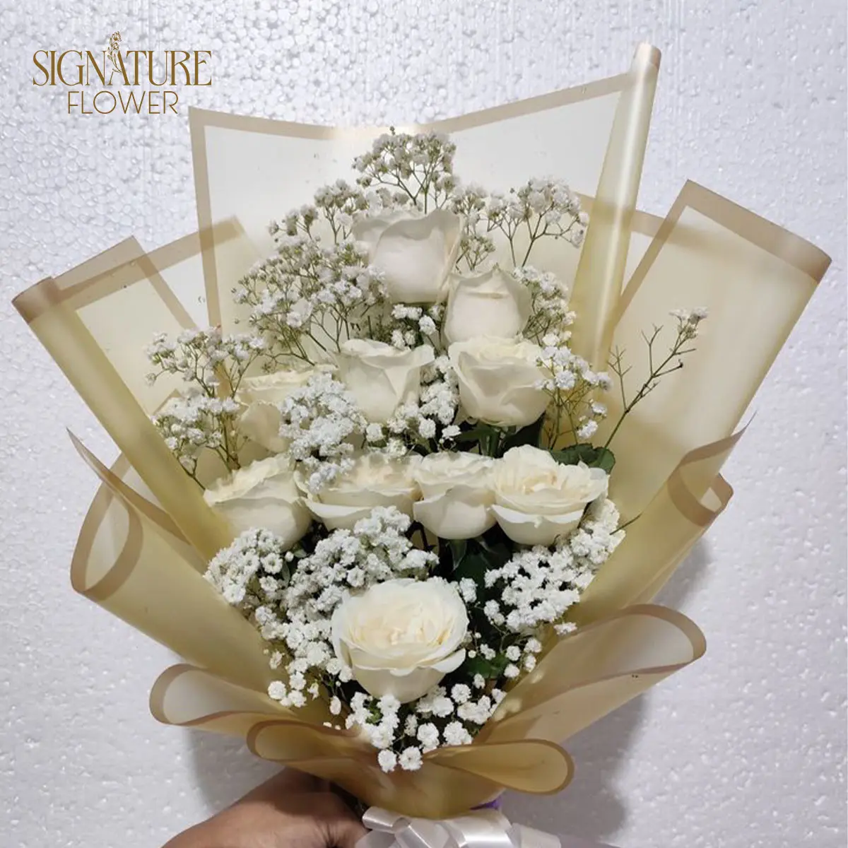 This delicate arrangement combines 10 pristine white roses with airy gypsophila for a classic, romantic look. The compact size makes it perfect for intimate gestures and small spaces.