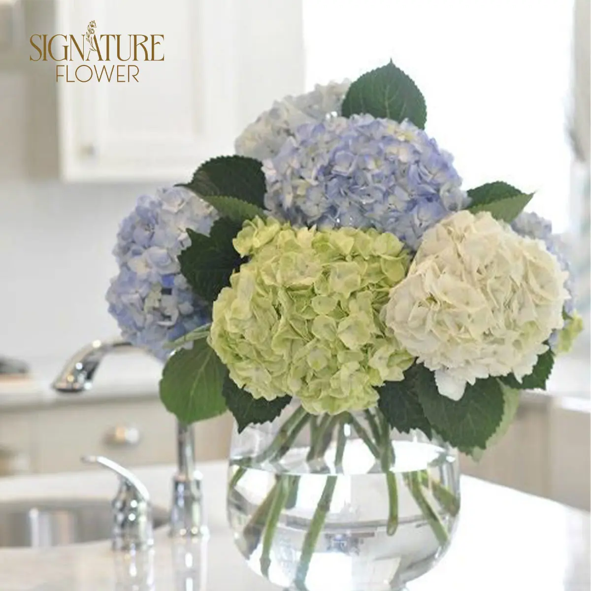 This vibrant arrangement showcases hydrangeas in a striking trio of colors – blue, white, and green – creating natural ombre effect in a stylish vase. The varied hues represent harmony and lasting beauty.
