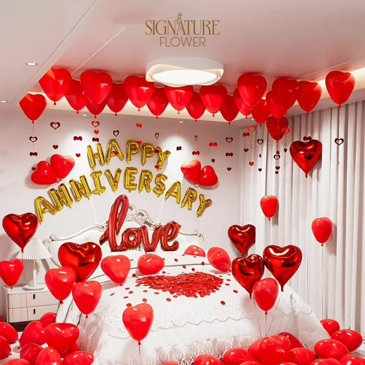 Our kinno anniversary balloons decorations,happy anniversary banner,red heart shaped balloons,large love balloons,rose petals,latex balloons