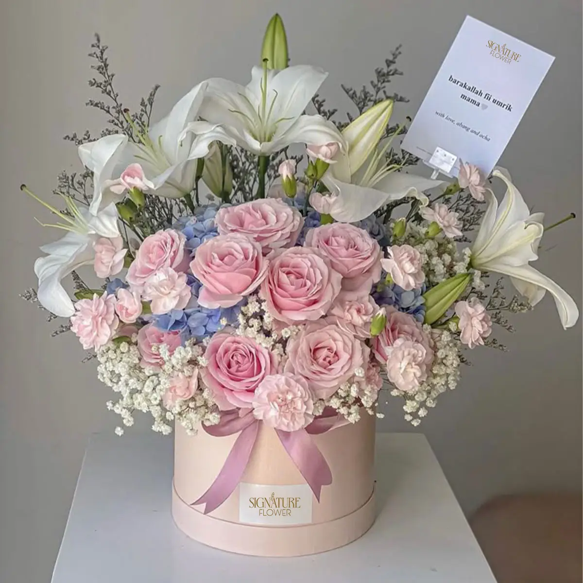 This classic arrangement combines romantic pink roses, long-lasting carnations, and fragrant lilies for a timeless expression of love. Available in three sizes to suit every occasion.