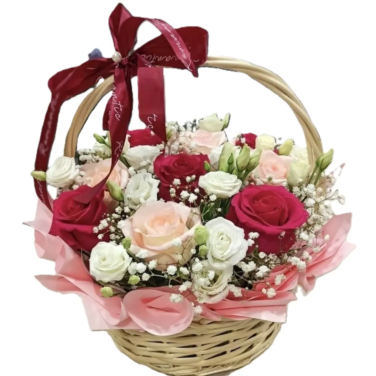 This lush arrangement combines romantic red roses, sweet pink blooms, and pure white flowers for a layered look that represents all facets of love. Perfect for when you can’t choose just one color.