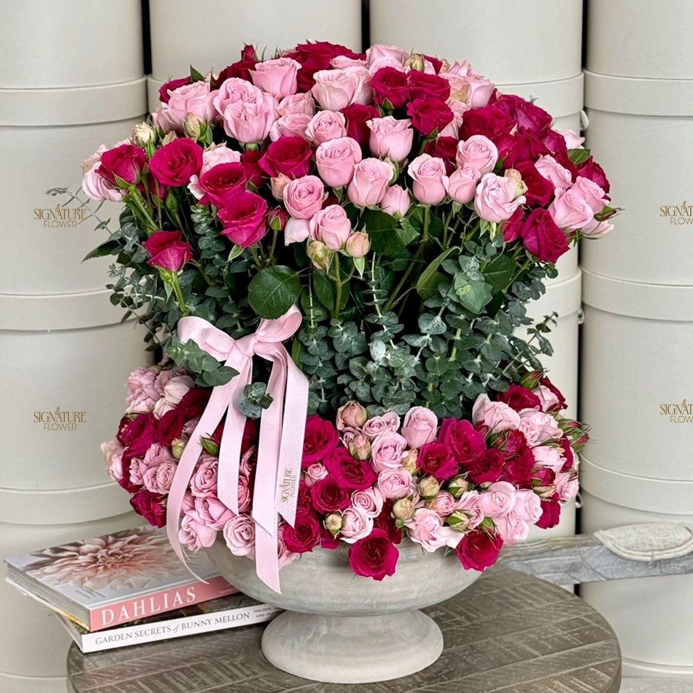 Ignite happiness with our Pinks & Fuchsia Garden—a riot of spray roses in bold fuchsia and pink, paired with fragrant eucalyptus. Housed in an earthy stone vase, it’s perfect for birthday flower delivery UAE, graduations, or hospital visits to uplift spirits.
