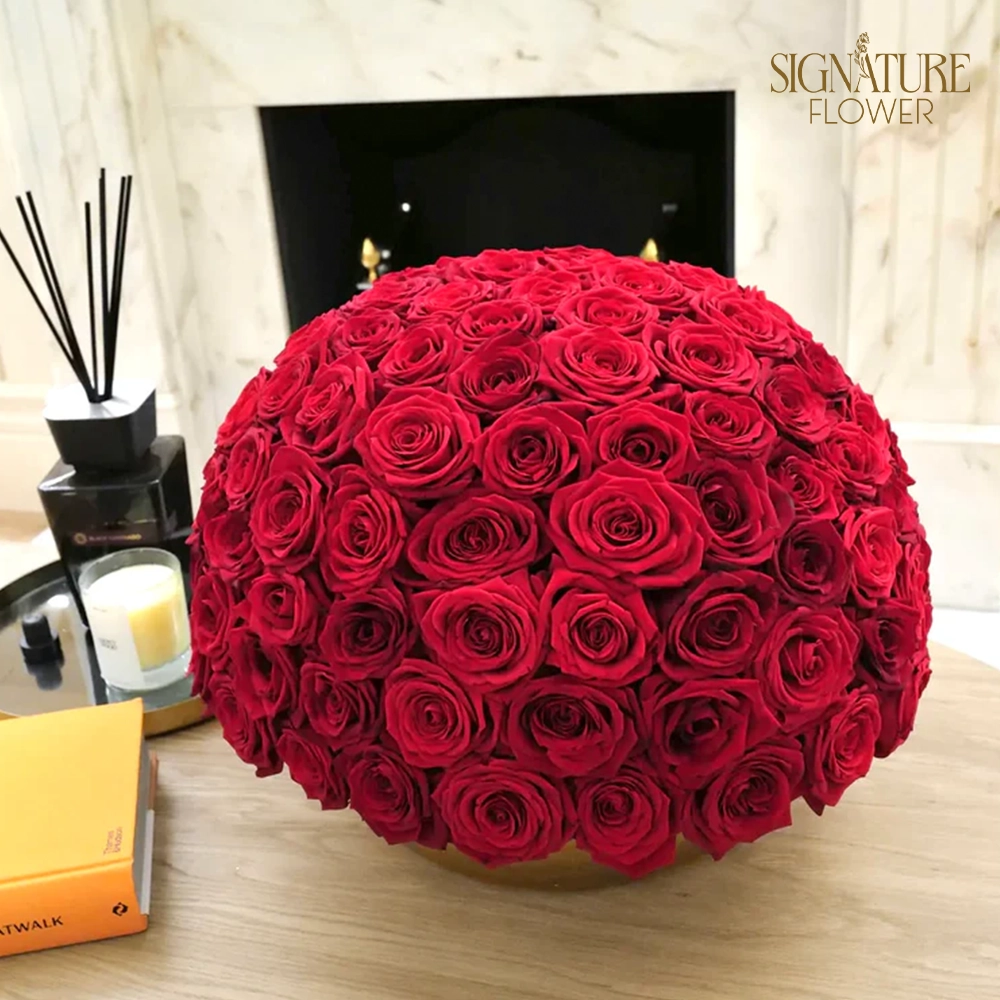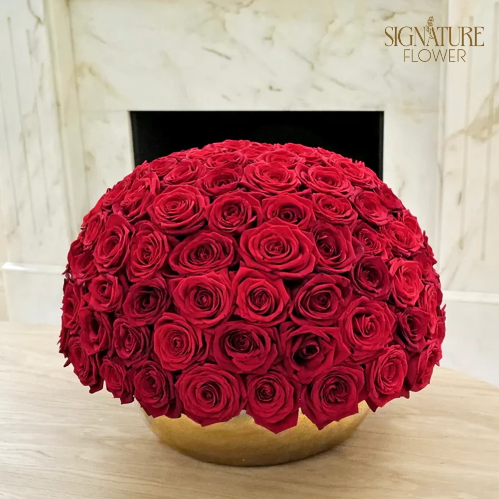 Our La Grande Beaute Signature dome shape is reimagined in our signature round gold vase. The unique style of these beautiful 150 red roses are warm and comforting in this gold vase and will surely compliment any space in your home. Say ”I Love You” with this extravagant arrangement.
