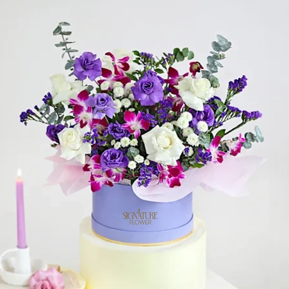 Nestled in a lavender round box, this regal bouquet combines pristine white roses, purple lisianthus, and aromatic eucalyptus. The frosted lavender wrap adds a touch of majesty, perfect for weddings, VIP events, or uplifting someone’s spirits.
