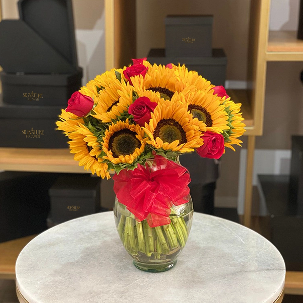 Vase with 12 Red Roses and 20 Sunflowers – Vibrant Seasonal Bouquet